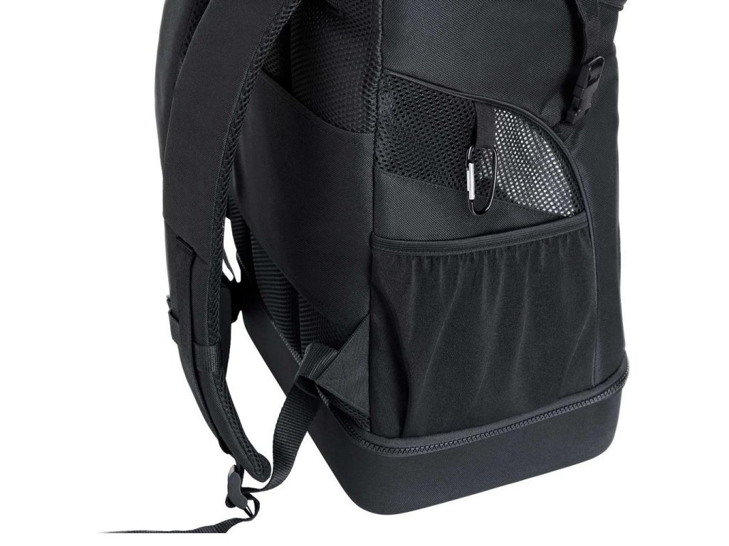 - Karabina zavěšená na boku k připevnění různých předmětů, jako je například cestovní miska.