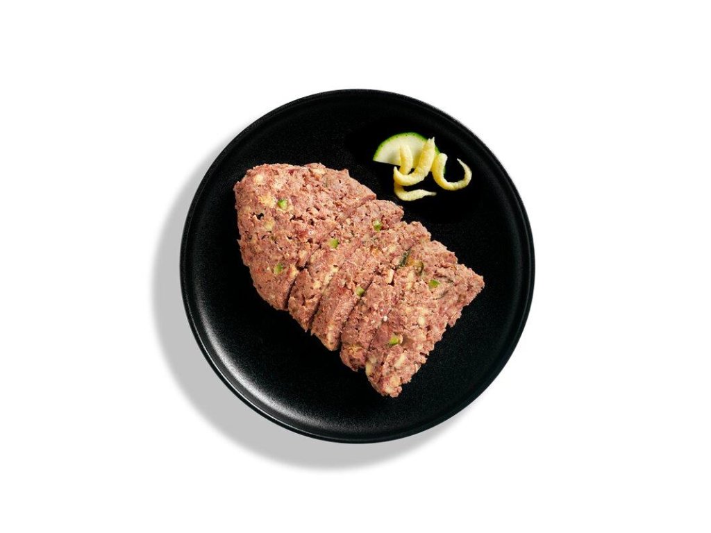 Čerstvé hovězí maso (63 %, svalovina, srdce, plíce, játra, dršťky), hovězí vývar (28 %), špecle (4 %), cuketa (4 %), světlicový olej (0,5 %), minerální látky (0,5 %)