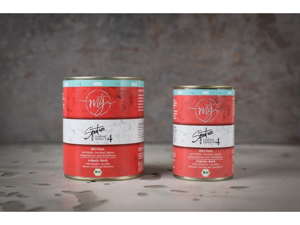 Konzerva pro psy my Signature menu - Bio kachna s dýní, cuketou, špenátem a rybízem 410g