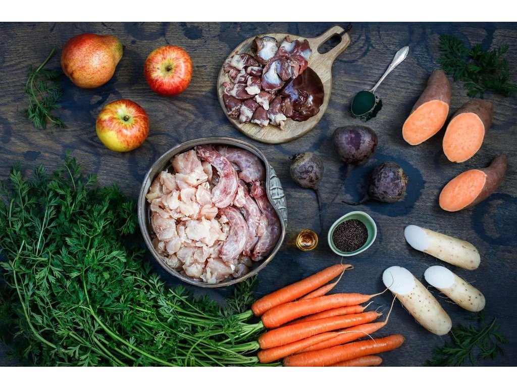 75 % masa z bio kuřete, z toho 40 % nejlepších bio kuřecích prsou, 15 % bio kuřecí žaludky, 10 % bio kuřecí krky, 10 % bio kuřecí droby (játra, srdce) – pochází z druhově vhodného ekologického chovu zvířat v Německu