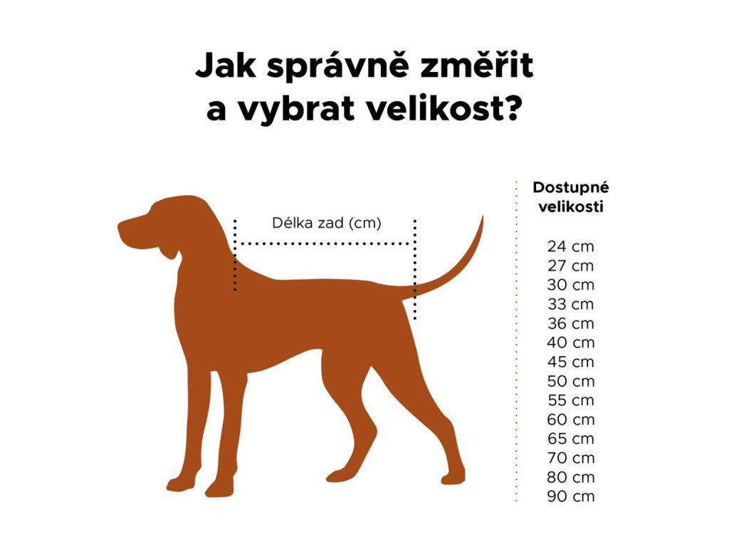Pláštěnka by měla sedět od kohoutku psa (trošku dál než má obojek) až po kořen ocasu. Doporučujeme chlupáče před objednáním důkladně změřit.