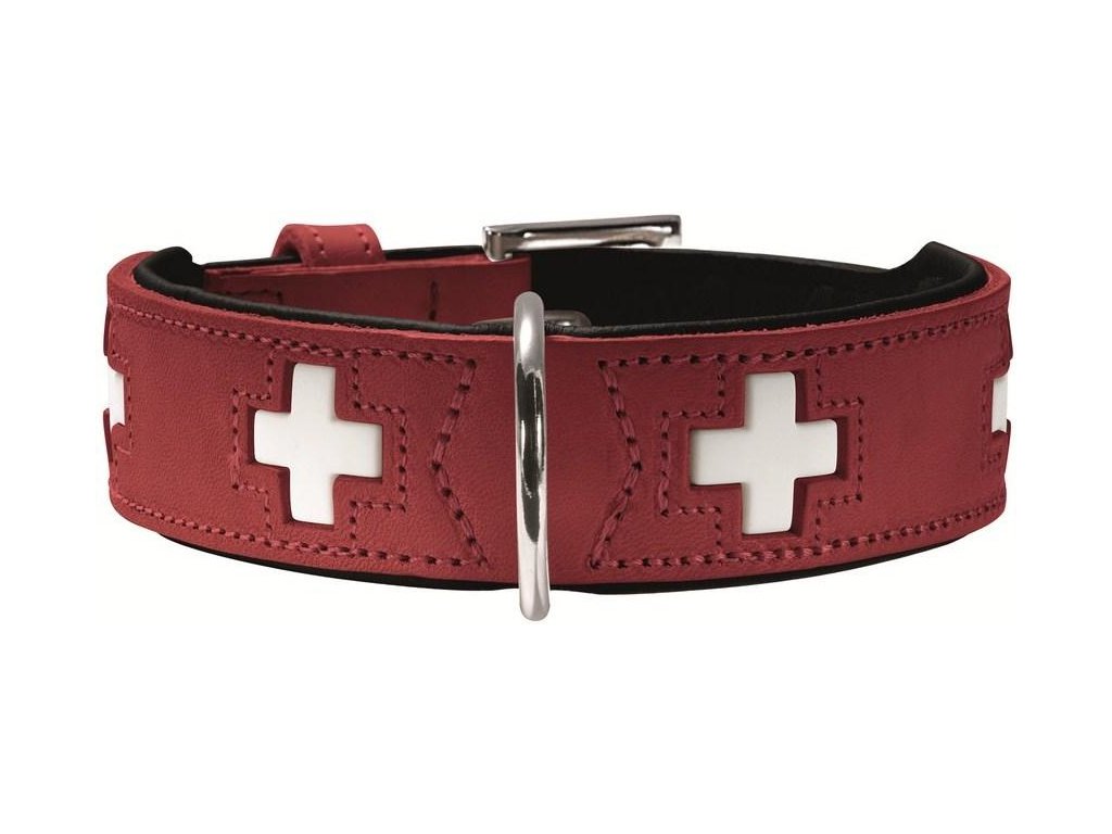 Obojek Swiss je zdoben, dle svého jména, švýcarskými křížky, vkládanými mezi vrstvy kůže. Kovové části jsou poniklované. Dostupný je ve čtyřech odstínech a mnoha velikostech, aby mohl zdobit velké i malé psy. I použité pigmenty a zušlechťující prostředky jsou EKO a zaručují, že je kůže jemná a brilantně se leskne na povrchu. Pro mimořádný komfort je Swiss lemován jemnou hovězí usní a má všitý kroužek pro uchycení vodítka.